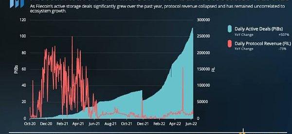 加密市场的另一个类别是去中心化基础设施。Filecoin,去中心化文件存储网络–于2021年6月启动了hyperdrive升级,使得交易吞吐量增加10-25倍。下图显示了在网络升级后,尽管网络使用率呈指数级增长。虽然协议收入很重要,发展并不总是依赖于它。就Filecoin而言,这次升级扩展了网络,继续为用户提供成本为亚马逊AWSS3费用0.001%的文件存储。