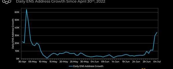 最近每日ENS注册飙升,在7月4日达到超过3万个新地址。分析称,这种飙升可能是由于ENS地址000.eth以破纪录的300ETH被购买。