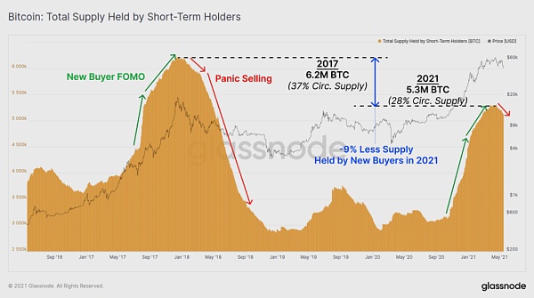 然而,需要注意的是,目前STH拥有的加密货币的峰值在加密货币数量和流通供应的百分比上都大大低于2017年。新持有人的加密货币最近达到了流通供应量的28%(5.3M BTC),比2017年的顶峰时少了9%。