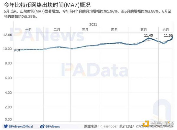 同样受到算力下降的影响,近期比特币网络的出块速度也有所增加。6月15日,比特币网络的出块间隔(MA7)约为11.55分钟,较月初增长了5.29%,为年内最长出块间隔。而实际上,从5月开始,比特币网络的出块速度就显著变慢了,5月出块间隔的涨幅约为3.88%。在此之前,今年前4个月,比特币网络出块间隔的月均涨幅仅为1.96%。
