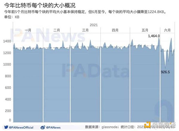 而且近期比特币网络产出的每个区块的大小也有明显的下降,根据统计,截至6月15日,本月平均区块大小约为1224.8 KB,最低日均区块大小仅为926.5 KB。而在本月之前,平均区块大小保持基本稳定,大约为1290 KB上下浮动。