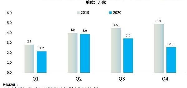 从季度数据来看,企查查数据显示,2020年第二季度和第三季度注册量较多,分别为3.9万家和3.5万家。第一季度和第四季度注册量较少,其中第一季度仅为2.2万家。相比2019年,2020年四个季度的注册量均呈下降趋势。