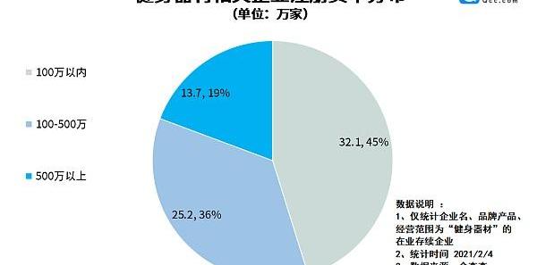 企业规模来看,企查查数据显示,注册资本在100万以内的健身器材企业较多,共32.1万家,达到了总量的45%。注册资本在500万以上的健身器材企业数量较少,占比总量的19%,可见健身器材相关企业以中小型企业居多。