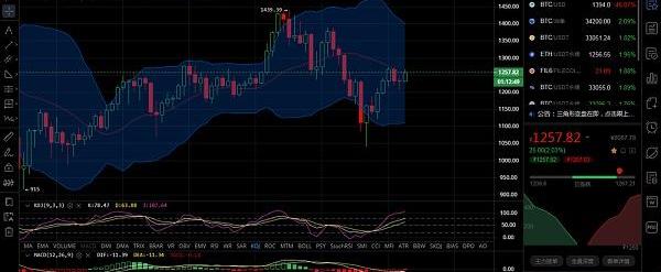 ??从四小时图上看,布林带呈向上开口,币价上行受阻于布林带中轨1370一线,结合指标上看,KDJ三线均向上发散,MACD空头能量柱即将走完,快慢线在0轴下方结金叉,操作思路建议回落做多。