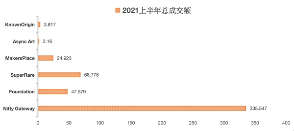 并且Nifty Gateway的成交额占了上半年几乎整个加密艺术销售额的70%,可以说是目前加密艺术领域的龙头平台。排名第二的是SuperRare,将近7千万的成交额,占了将近14%的比例。
