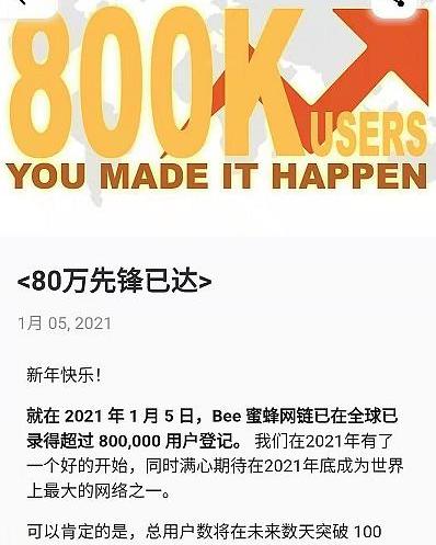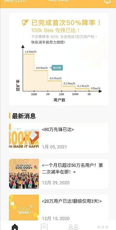 新消息!2021年1月5日,BeeNetwork注册用户达到80w,可见Bee挖矿项目的上升!12月12日已经实现第一次算力减半,距离100万用户预计也会很快,即将进行下一次算力减半,所以请抓住机会,未来机会在等你!