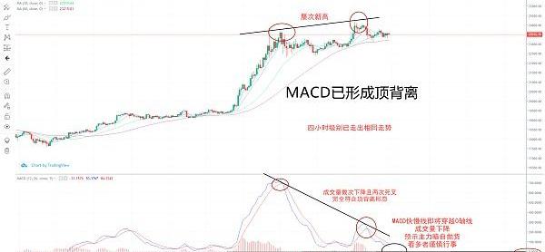 从上图中咱们可以发现比特币历史高点屡次刷新,但MACD成交量呈下行,且已两次死叉下行,双线正在强力下压成交量,成交量多次回到0轴下方,但比特币的价格依旧处在上行阶段,按照正常情况来说,成交量应该持续刷新新高才对,但此时MACD所反映的状态太过反常且MACD快慢线屡次交叉下压,而且即将穿越MACD的0轴中心线,在股市来看,这种情况被称之为顶背离,其实就是在暗示庄家在暗中出货,散户接盘的阶段,看多者得谨慎行事这次下跌个人预计将会回到21000附近如果导致市场恐慌回到20000关口处也不是什么难题。