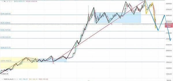 情况二:自24288下跌以来只进行了笔破坏的1,未来还有2反弹、3下跌。跌破22366可以短期行情见顶。见蓝线。