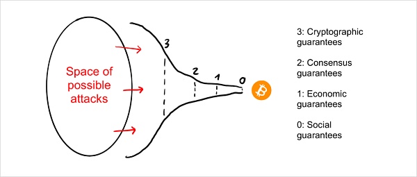 要想永远摧毁一条公链,必须摧毁用户对其账本状态(所有权清单)的信任,还要让这条公链无法可靠地更新账本状态。外面几个安全层都是为了防止这种情况发生。