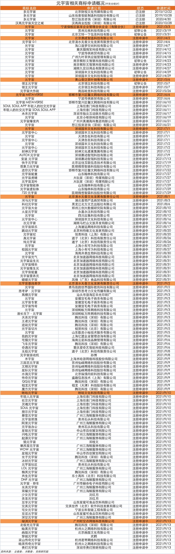 值得提出的是,在此之后,虽然个别企业被监管部门下关注函、约谈,但耐不住资本市场对元宇宙的狂热。“元宇宙”相关商标注申请更是翻番,9月8日-9月18日约有53个注册申请。