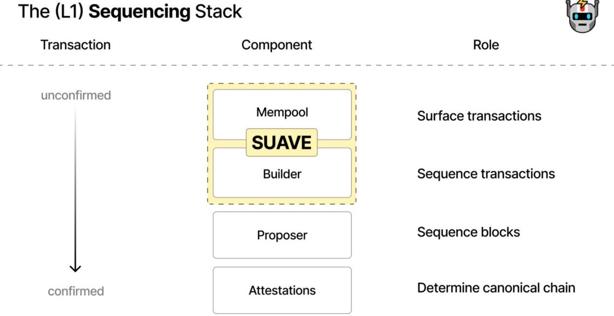 SUAVE是一个兼容EVM的区块链网络,但其目的是处理交易排序和区块构建,而不是支持部署各种dApp。简单来说,SUAVE既是用于交易排序的区块构建者网络,也是用于存储第1层网络的预确认交易的内存池。此外,SUAVE兼容各种EVM系网络,这意味着它不仅可以用于以太坊,还可以用于L2网络,如Optimism、Polygon和Arbitrum。