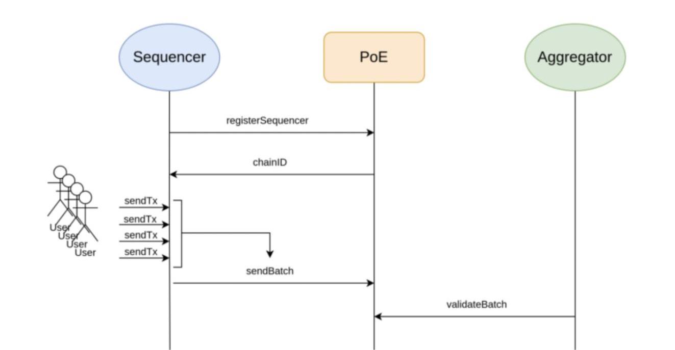 PolygonzkEVM由PolygonHermez更名,计划通过将名为效率证明(PoE)的共识算法引入Rollup网络来实现排序器去中心化。PoE的工作方式如下所述,并将现有排序器角色拆分为排序器和聚合器。排序器将用户的交易聚合成批次,并将它们提交给以太坊L1上的智能合约,聚合器验证排序器发布的交易批次。关于PoE及其前身捐赠证明(PoD)的详细解释,请参阅《Polygon,模块化区块链未来的领跑者》一文的第5部分。