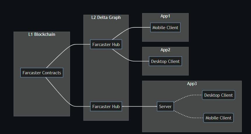 尽管Farcaster在其技术堆栈的一部分上利用了Ethereum,但它并没有在区块链上托管整个社交网络。相反,FarcasterID在Ethereum上注册,而其社交图谱和内容则托管在称为Hubs的节点网络上。这些Hubs确保网络的一致性,因为它们复制所有数据和签名的消息。Farcaster协议还会修剪消息,使Hubs变得轻量化,提高了协议的去中心化程度。