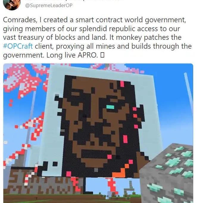 一个名为SupremeLeaderOP的玩家,通过部署链上智能合约,创建了一个共产主义共和国,并制定了一套相应的规则。任何自愿加入共和国的玩家都将放弃他们现有的所有财产,并按照社会主义哲学,将他们的存货合并到一个集体共享的国库。