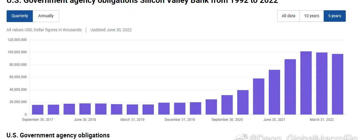 面对负债端资金的大量流入,SVB资产端可投资资金也快速上升。2020-2021年美联储还没有开始加息,如果把钱趴在美联储的准备金账户上,年化只有低的可怜的0.1%的利息。SVB的选择是,买大量的美债和MBS。从它的10-Q来看,2020年年中到2021年末,SVB增持了120亿的美债,持有量从40亿增长到了160亿。更重要的是,SVB增持了大约800亿美元的MBS,持有量从200多亿增长到了1000亿。这是什么概念呢?SVB总资产规模大约2000亿美元,相当于它将一半的资产配置在了MBS上,或者认为它将2020-2021年新增流入的超过1100亿存款中的70%配置在了MBS上。这对于一家以贷款为主营业务的商业银行而言几乎是难以置信的,甚至是荒唐的。