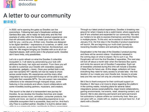 1月25日,头部?NFT?收藏品?Doodles向社区发布了一份公开信,信中预告了其全新系列Doodles2接下来的一些关键动态。