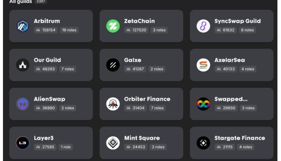 Guild是一个基于DID的门控类应用。通过Guid平台,可以设置Discord或者Telegram的进入条件,比如持有哪些token,哪些NFT等。目前已经有基于众多项目的3000多个门控任务,知名的Layer2Arbitrum的最新角色任务就是通过此平台进行。