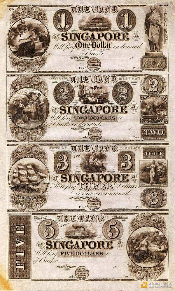 在 1836 年至 1865 年期间,野猫银行与州立银行并存,银行会发行可兑换流通金、银币的私人美元,而这些存款的储备由政府债券或房地产票据支撑。在这个时期,大量野猫银行破产,为储户留下了一文不值的「美元」。