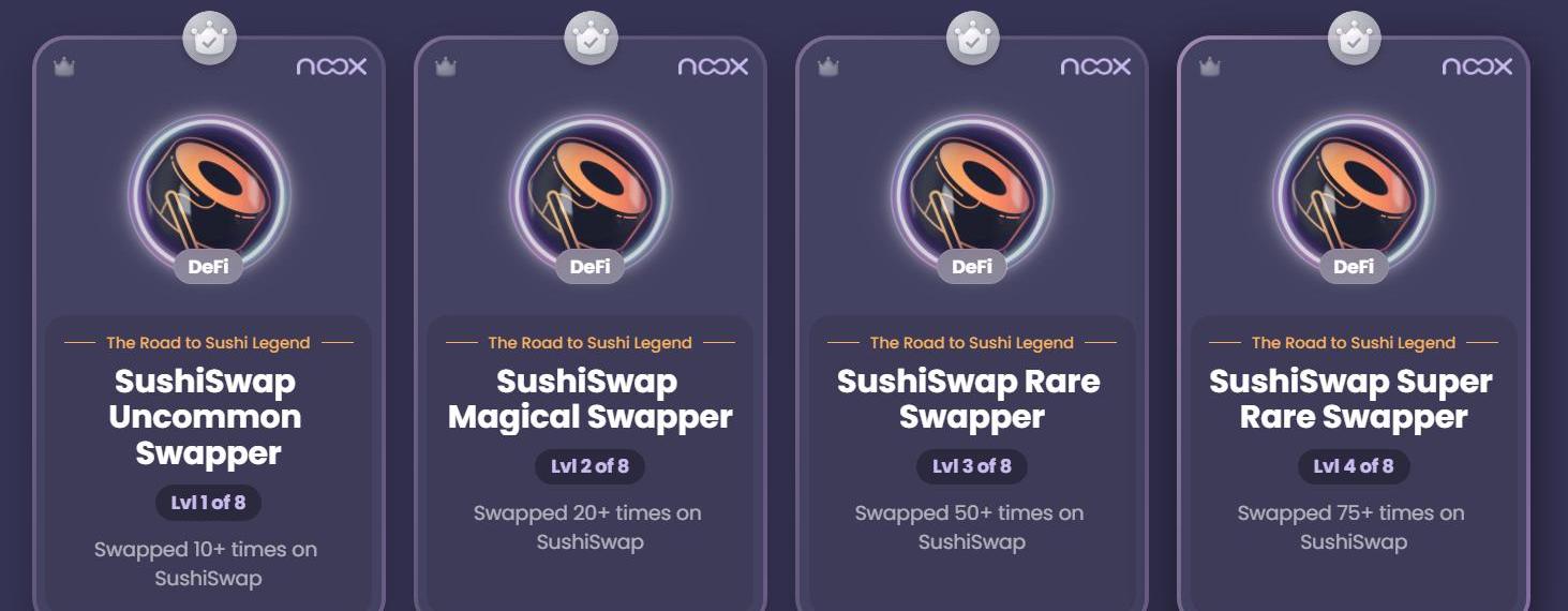 Noox是以太坊生态旨在构建一个去中心化的成就证明平台,用户在满足相应条件后,即可铸造对应的NFT,称为「徽章」。Noox徽章记录着用户的链上行为,用户能够可视化他们所做的事情,如通过SushiSwap的徽章,用户可以了解自己在SushiSwap上的交易次数范围。
