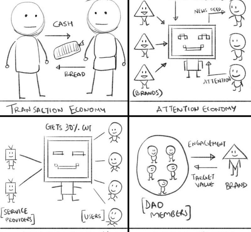 社区经济:社区经济是合作社的演变。互联网让我们接触到全球市场,智能合约使我们无需中介就可以相互信任。我们一直处于探索替代经济模式的阶段。这就是?DAO?的意义所在,它们将个人自治与以前不存在的经济机会联系起来。