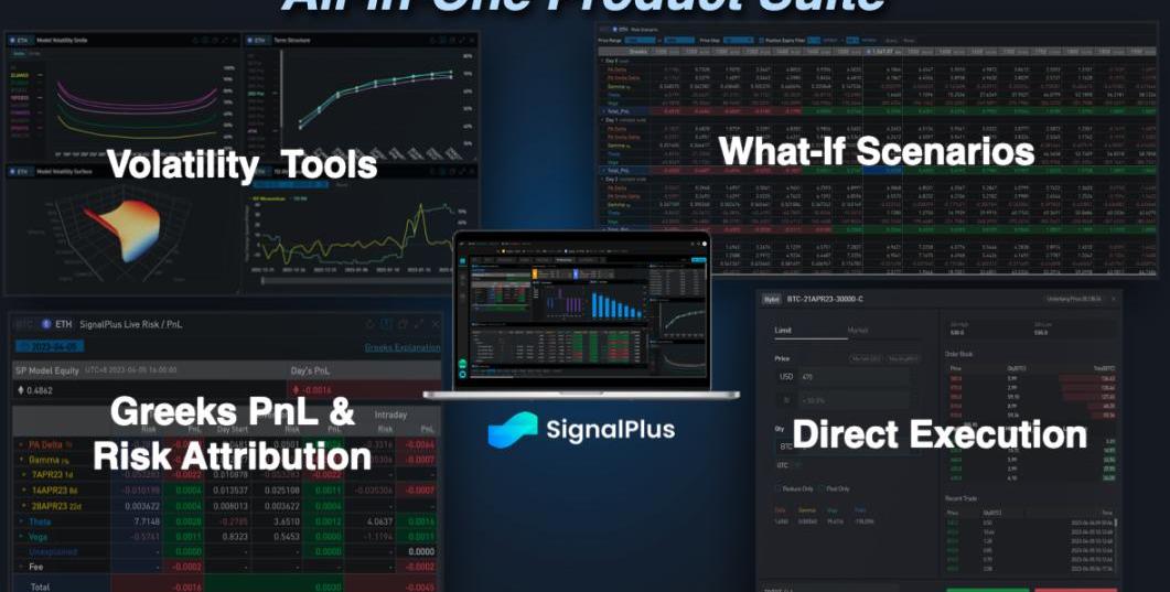 Source:Signalplus回到我们的产品,所涵盖的核心服务包括:交易终端:我们的旗舰产品,一站式专业交易终端可以满足专业期权交易员的所有需求。波动率分析工具:完整的3D波动率曲面、期限结构、波动率偏斜和动量信号等工具,涵盖BTC和ETH。风险归因:投行等级的风险和损益归因分析工具将所有数据拆分为一阶和二阶希腊字母,且依据不同交易所的设置,可以以U本位、币本位或者混合模式来显示。风险情景分析:针对仓位在不同的市场情况下将如何表现的情景分析,使用户能够在意外情况发生前做好准备。直接下单:直接在我们的平台上执行交易,速度快,更加便利。