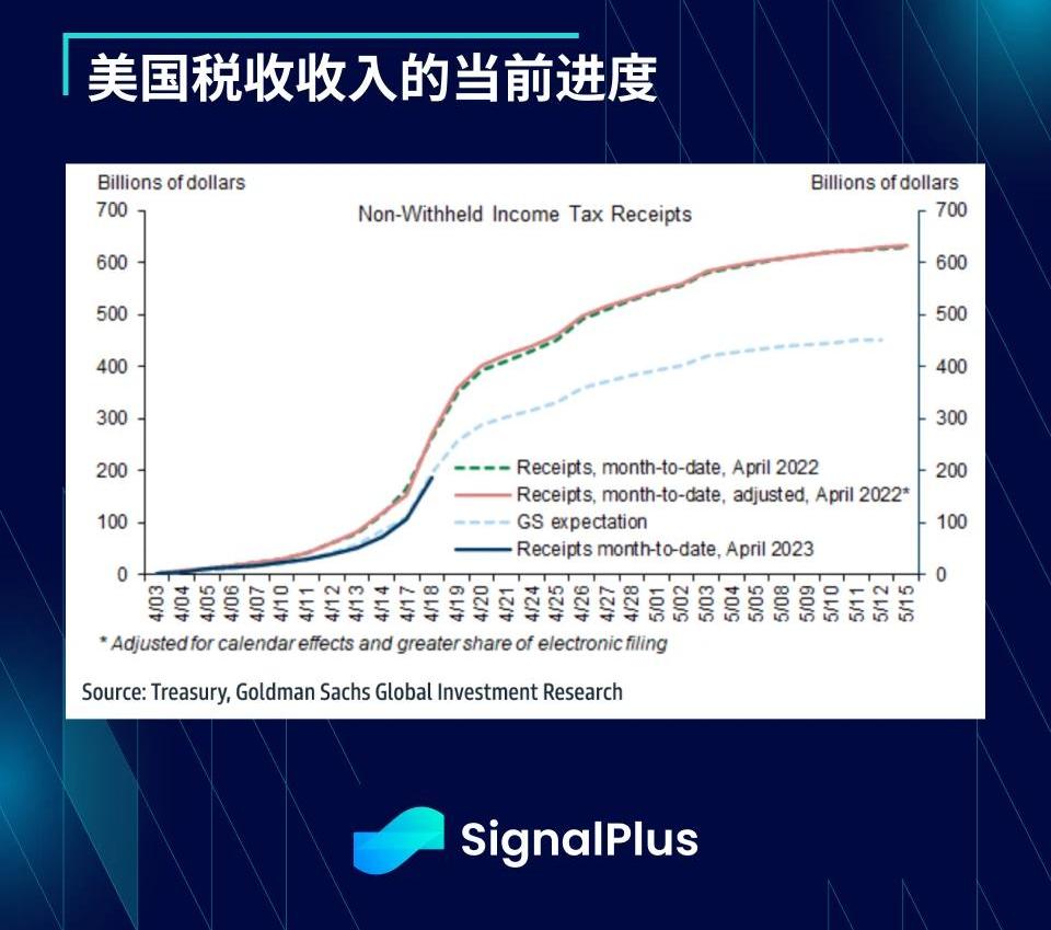 TradFi市场的价格波动在纽约交易时段的大部分时间里都十分平淡,直到下午2点褐皮书发布,其中悲观信息居多,像是“消费者和企业的放贷量和贷款需求都普遍下降”、“整体金融行业的情况急剧恶化,恰逢银行业近期面临压力”,以及“贷款活动大幅减少…报告显示,由于融资成本上升、不确定性增加以及信贷条件更加受限,不同行业的现有或者计划中的项目都被推迟或取消”。不过,昨天最重要的数据可能是通常不引人注目的每日财政报告(DailyTreasuryStatement),随著2022年税收即将到期,经济学家和利率交易员会密切关注该报告。从昨天到下周二,财政部预计将收到约75%的非预扣税款,由于经济走软,本月为止税收收入的情况比去年低约30%。