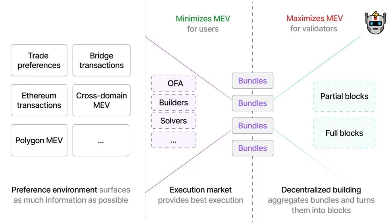 Flashbots正在积极研究一种解决方案,通过协作构建区块来分散构建区块的角色。该项目称为SingleUnifyingAuctionforValueExpression(SUAVE)。SUAVE于2022年10月14日在一年一度的以太坊开发者大会Devcon期间由Flashbots的联合创始人PhilDaian提出。Daian将其描述为一个MEV感知的加密内存池,用于将MEV利润返还给最终用户。11月下旬,Flashbots发表了一篇博文,标题为《MEV的未来是SUAVE》,揭示了有关该项目的更多细节。该博客将SUAVE描述为一个独立的区块链网络,可用于提取跨链MEV。文章称,「重要的是,SUAVE超越了单个区块链的排序。我们将SUAVE设计为所有区块链的内存池和区块生成器」。今天,关于SUAVE如何工作的技术细节很少。当前有关SUAVE的可用信息说明了启发产品架构的思维框架,而不是详细说明SUAVE本身的架构。理论上,SUAVE将是一个区块链,它能够接受来自多个区块链的用户偏好表达,然后协助区块构建者的去中心化网络以无需信任的方式向每一个网络提出区块。SUAVE链将由三个主要部分组成:通用偏好环境、最优执行市场和去中心化区块构建网络。