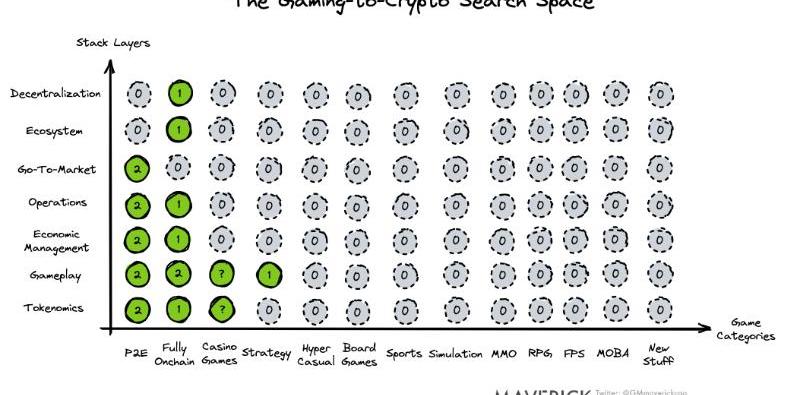 除了以太坊外,游戏一直是新技术的重要测试场。关于如何让加密货币+游戏相互作用的集体思考通常会采取以下两种方向:从加密到游戏:从加密的核心特性开始,将其发展成一种有趣的体验。从游戏到加密:调查现有游戏的领域,找到加密最有可能适应并增加价值的部分。我们Maverick略带偏见地倾向于第一种方法。但本文关注于第二种方法,我们对此感兴趣但并不是很熟悉,并且非常好奇向那些知道更多的人学习。我们将游戏到加密的搜索空间可视化如下: