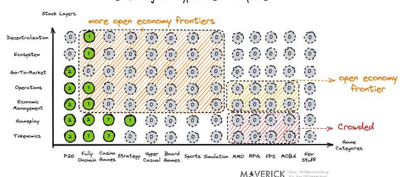 横向:有许多游戏类型,每个类型都有自己的领域专业知识、目标受众、游戏玩法和游戏内动态。垂直:一个成功和盈利的游戏产品需要大多数层次结合在一起:代币经济、游戏玩法、GTM、运营、经济管理、生态系统和去中心化等等。一个薄弱的层次可能很容易摧毁整个体验。由于加密货币+游戏是如此新颖,还没有针对任何单一层的尝试和验证设计。找到单个单元的最优解已经很难了。找到能够共同工作的垂直线则更是难了几个数量级。我们相信,在找到全栈解决方案之前,我们将看到更多的迭代、实验和试错。单元格:每个单元格中的数字表示加密空间已经看到的相对成功的尝试次数。即使最终失败,每个成功的游戏都将推动加密的集体专业知识向前发展,并使我们更接近最终解决一个或两个单元格。迄今为止,最知名的迭代发生在P2E、完全基于链上、游戏和策略游戏。集体探索:加密游戏领域的建设者们建立和迭代他们的产品,以便我们拥有更多更高数字的绿点。随着我们积累集体专业知识、才华、经验、最佳实践和案例研究,我们在概率上越来越接近创造正确的加密游戏。