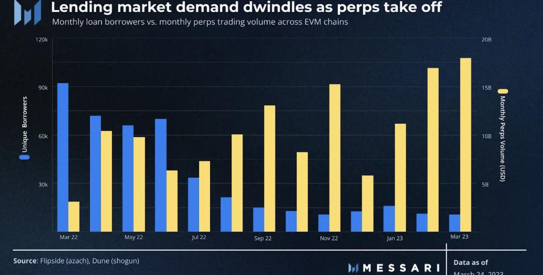 与Optimism相比,Arbitrum在过去一年中保持了稳定且可以说更有机的用户增长。每增加一个衍生品平台,它的新用户就会增加。在Optimism的任务活动结束后,Arbitrum占据了EVM链上约80%的衍生品交易者的主导地位。GMX作为Arbitrum上的单一衍生品交易平台开始受到关注,但生态系统只有在竞争出现后才能起飞。由于衍生品交易员已经在Arbitrum上,因此在相似的平台之间切换几乎没有摩擦,从而创造了一种健康的竞争形式。考虑到这一点,新兴DeFi生态系统之间的关键区别可能是多样化的竞争格局,它在更大的生态系统中既可组合又可被广泛采用。例如,像Gains和GMX这样的衍生品平台分别存在于Polygon和Avalanche上。但是,直到它们最近在Arbitrum和Optimism的热潮,他们才获得显著的吸引力。此外,一旦GMX的流动性代币(GLP)被接受为整个Arbitrum生态系统的抵押品,它就增强了提供流动性的效用,并使GMX能够吸引更大的交易者。随着这些新兴链的不断发展,它们应该寻求在更大的DeFi生态系统中建立可持续的利基市场,以发展持久的用户保留率和持续的收入流。借贷
