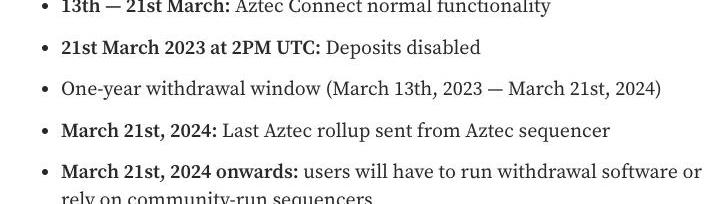 3月13日,ZKRollup隐私及扩容解决方案AztecNetwork宣布将逐步关停其DeFi隐私桥项目AztecConnect,并将在一周后禁用从zk.money和其他前端将资金存入AztecConnect合约。AztecNetwork补充表示,提款功能仍将持续开放1年,预计直到2024年3月21日才会彻底放弃AztecConnect合约并停止运行Rollup排序器,但仍建议用户尽快提取资金。