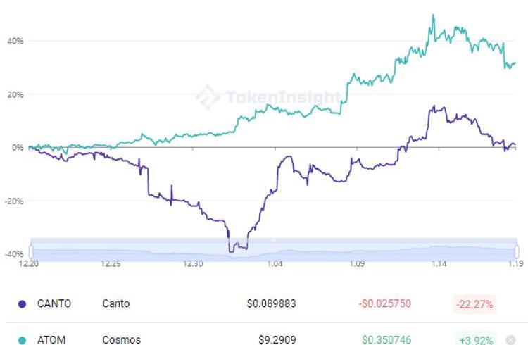 Canto是一个无需许可的通用区块链,运行基于Cosmos构建的以太坊虚拟机。Canto提供由Canto验证节点保护的Tendermint共识和通过CosmosSDK构建的EVM执行层,以及旨在支持免费公共基础设施的核心财务功能。这些功能包括:CantoDEXCanto借贷市场$NOTE:由CLM发行的完全抵押的单位通证,它也作为USDC/USDT软挂钩稳定币服务于Canto生态系统不过,需要指出的是,$CANTO的表现在最近甚至比不上$ATOM。