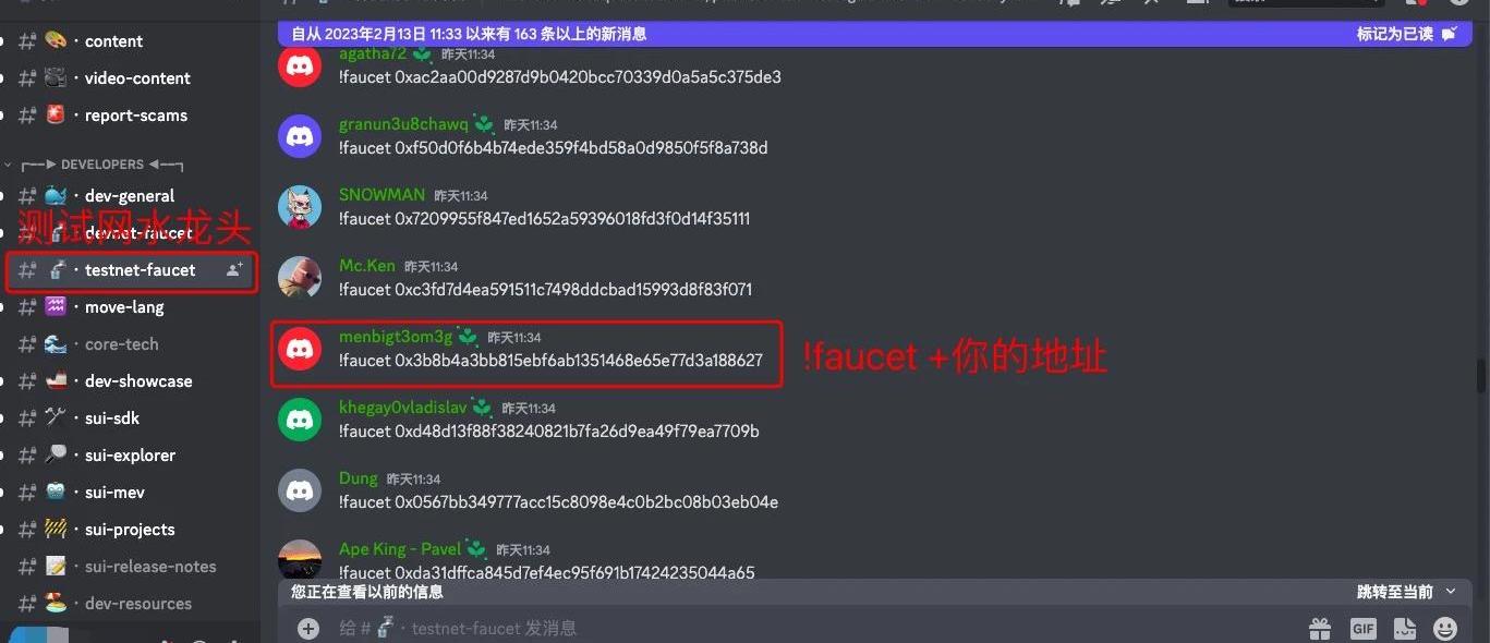 SuiWallet安装完成后,选择到Sui测试网。由于钱包中没有测试币,需要前往水龙头领取——复制钱包地址,前往SuiDiscord社区「测试网水龙头」频道领取测试币
