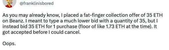 2.存入ETH前检查你之前的Bid如果你帐户里的ETH余额低于Bid价格,Blur的Bid模式将被停用。如果你又将足够的ETH重新添加到你的帐户中,则会重新激活交易。这会出现什么问题呢?让我们来看一下:首先,你有个被停用的Bid。其次,某NFT收藏品的地板价下跌。此时,你又向你的账户中存入了更多的ETH。由于账户里的资金充足,于是你之前的Bid的交易被重新激活,而此时,NFT地板价却已经下跌,那么在这过程中,你以高于地板价的价格购买了该NFT。3.在NFT上线前请仔细了解NFT的各类信息Bid之前,请认真的查看NFT的各项信息,看看它是否稀有,并检查OpenSea上是否有高于Blur地板价的报价,综合评估后,再给出适合的Bid。4.不要手滑!你Bid越多,你就越有可能在某个时候犯错误。\n\nBlur的无缝投标体验非常有助于提高效率,但加速过程也会让你减少检查错误的时间。\n\n即使是一些最好的交易者也容易犯这个错误。例如,NFTOGFranklin在购买Beanz的时候因手滑对当时地板价为1.73ETH的Beanz出价35ETH,且该笔交易在其想要取消之前就被接受了。