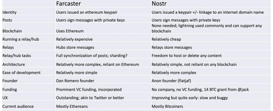 Nostr是一个最简化的协议,致力于创建一个抗审查的全球“社交”网络,这样的愿景反应的是当下的社交困境:社交网络被审查,不自由。最常谈的例子当然是推特,但是,推特做错了吗?我觉得未必,因为他是一家在美国登记注册的私营公司,这注定了它需要接受监管,要对股东负责,要有盈利的商业模式……它是一家商业公司,而不是言论自由的卫道者。作为一家公司,他有权制定自己的言论审查边界,比如当各种儿童、仇杀、种族仇恨的言论充斥平台,必然导致劣币驱逐良币,从而影响广告商的投放需求,此外,政府、公众舆论甚至是内部员工的意见都可能成为压力,影响到言论审查。谁来捍卫社交网络的自由?我觉得不应让公司或者说应用来全然承担责任,而是交由类似于Nostr、Farcaster这样的协议,代码保障自由。用最常见的比方,Nostr、Farcaster就是社交的Layer1,提供了一个真正自由的“公共”空间,其他各类开发者、私营公司可以基于这个公共广场构建应用,理论上推特等经典WEB2应用也可以基于Nostr构建,在社交的Layer2比拼的是UI\\UX,策展,运营……各家应用可能有不同的言论审查尺度,但这不影响“源信息”的存在,哪怕某些信息在某个应用被屏蔽了,在另外一个应用,他依然能够展示,这也让每个人可以自由选择自己喜欢的应用。Nostr、Farcaster则是比较有代表性的社交协议层,此外,还有LensProtocol、和DeSo,他们有着同一个目标,但技术路线甚至是“协议性格”都有所不同。综合对比,Nostr和Farcaster,一个简单的结论是:Nostr更像比特币,Farcaster更像以太坊。本质上看,Farcaster依然是一家由VC提供资金支持的公司,由前Coinbase高管DanRomero建立,在2022年7月获得了3000万美元融资,a16z领投。Farcaster的早期邀请用户群主要是VC、项目方创始人、以太坊社区用户。在设计上,Farcaster使用以太坊架构,在Farcaster上创建个人资料会生成助记词和以太坊Goerli测试网上的身份,Farcaster选择在链上托管用户身份信息,即全球数据注册处。因为在链上存储信息本身是昂贵的,Farcaster的取舍是,将一个人的身份信息以及读写数据的能力存于链上,其它数据信息则会被存储在链下服务器FarcasterHubs中,以此确保用户可以完全掌握自己的身份、社交关系以及数据信息。目前,有超过30个应用程序建立在Farcaster协议上。
