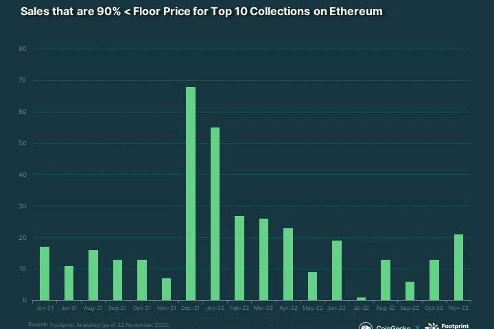 资料来源:FootprintAnalytics以上的图包含了所以根据当时地板价低于90%以下的NFT交易。从交易行为来看,最高的月度销售额在2021年12月,其次是2022年1月。巧合的是,这是许多司法管辖区的报税的月份。我们可以安全的假设在这些时段的低于90%地板价交易中的大多数都涉及实现交易随时,减交税额的意图。