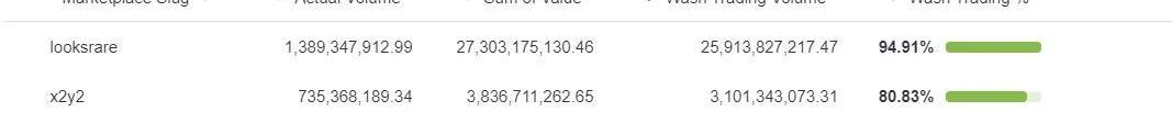 LooksRare和X2Y2是最著名代币化的NFT市场。平台代币在平台上以交易奖励的方式分发给大交易者们。洗盘交易者利用这个机制,通过在他们拥有的钱包之间来回交易,每天产生极其大量的交易量,从而最大化他们的交易奖励回报。为了识别出这些赚取交易奖励类型的洗盘交易,我们根据以下规则过滤了LooksRare和X2Y2上的洗盘交易:价格过高的NFT交易版税为0%的收藏品NFT购买量超过正常数量一天中的次数同一买家地址在短时间内购买的NFT通过这些规则过滤之后,我们发现自这两个NFT交易平台推出以来,有80%以上的交易量都是洗盘交易: