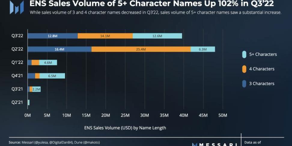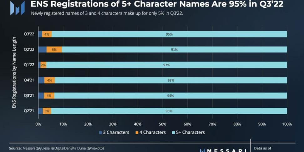 就ENS名称长度而言,在22年第三季度的所有112万个注册中,超过5个字符的名称占106万个。值得注意的是,从22年第二季度的60万到22年第三季度的110万,绝对值环比增长79%,超过5个字符名称的注册增长速度快于整体ENS注册。存在两种可能的解释:较长的名称更便宜,流行的3和4字符名称已大量注册。这种成本和稀缺性的结合导致注册了更多5个以上的字符名称。