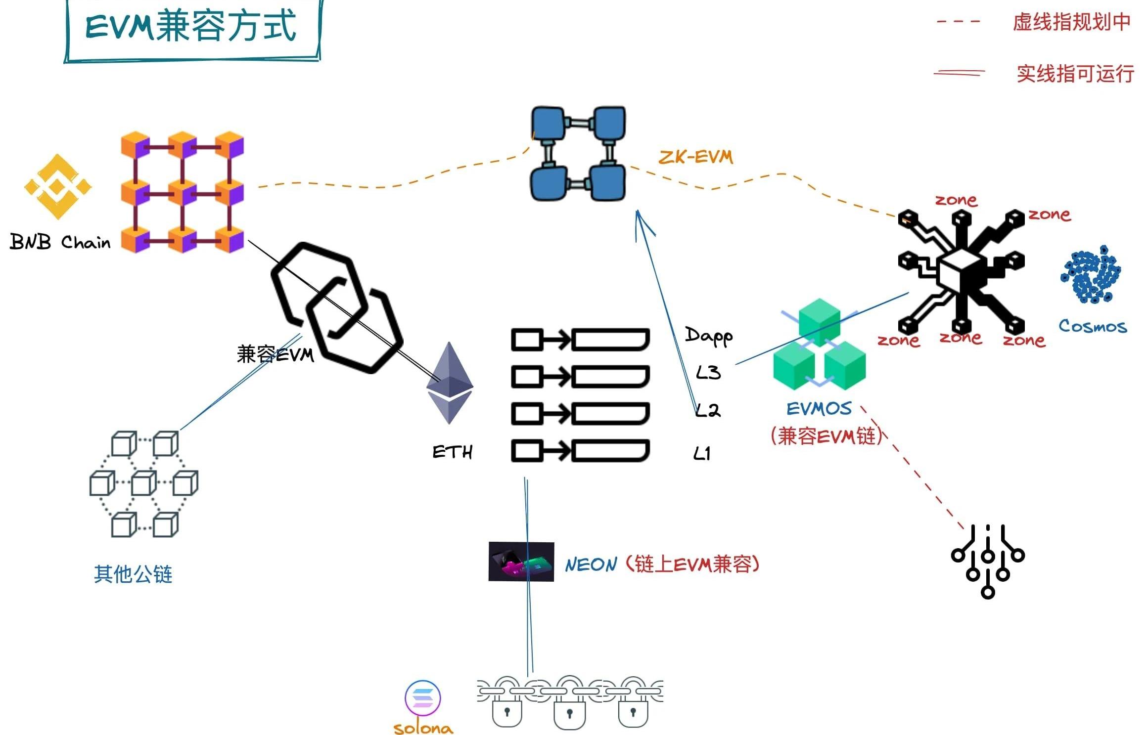图片说明:EVM兼容方案一览图源:R3PO在此时,主要还是其他公链在主动出击,而以太坊在埋头改进自己的旧疴,比如PoW转PoS、L2道路选择、账户抽象的实现、DankSharding等,在兼容路径上,主要有实现EVM、借助应用实现链间兼容和EVM兼容链三种。公链实现EVM兼容,以BNBChain等为代表。BNBChain或者OKXChain等交易所公链,凭借交易所的用户基数,以及对项目的运营能力,其链上TVL和生态也不容小觑,以BNBChain为例,据DeFiLlama数据,其上运行492种协议,TVL达60亿美元,按照规模和体量而言,是仅次于以太坊的第二大公链。其最主要运作模式“模仿”以太坊,比如其上的最大DEXPancakeswap最早便是Uniswap的分叉版本,同一种Dapp可以无缝在两条公链上切换,背后便是EVM兼容带来的巨大优势,项目方只需要专注于运营,而不必从头开发产品。链上EVM兼容,以Solona为代表。Solona是一种PoH机制的单体区块链,也长期是市值前十的公链项目中唯一未兼容EVM的公链,但并不是说其无法和EVM兼容链通信,其在链上运行的Neon项目提供了EVM兼容能力。可以把这种兼容理解为套娃式兼容,而非直接在公链本体层面进行兼容。Neon提供了高度类似于EVM本身的开发体验,比如Solidity语言编程支持、无缝衔接的智能合约部署体验、直接调用MetaMask,和Truffle等开发套件。兼容EVM链,以EVMOS为代表。Cosmos或者波卡等模块化区块链的可选方式更多,其上的应用本身便可单独成为L1级别的公链,而EVMOS便同时是Cosmos的一条子链,也是提供EVM兼容性的公链,这意味着Evmos不仅可在Cosmos之间“传递”EVM兼容性,在任意其他公链之间都可提供EVM兼容性。除了作为EVM兼容性提供商,其本身也可作为公链部署DeFi等应用,比如其上的DEXExswap就是Uniswap的分叉版本。本段小结:正是这种广泛的兼容促成了整个公链世界的打通,而其中的纽带就是EVM兼容性、跨链桥以及交易所,鉴于此,R3PO总结了如上的兼容性的具体流派,来为ZKEVM的终结者角色做赛前预热。欲胜人者,必先自胜:ZKEVM是以太坊的主动出击