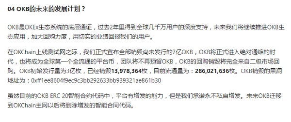 而关于OKB不再增发,官方消息称,未来OKB迁移至OKChain运行将删除增发的智能合同代码,并承诺永不私自增发。