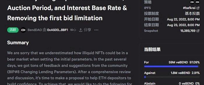 8月22日,BendDAO联合创始人@CodeInCoffee在社交媒体透露社区已经发布新提案BIP#9,旨在通过修改部分参数解决流动性危机,具体包括:1、将清算阈值调整为70%,具体步骤如下:UTC时间8月30日中午12点更新至85%UTC时间9月6日中午12点更新至80%UTC时间9月13日中午12点更新至75%UTC时间9月20日中午12点更新至70%2、将拍卖时间调整为4小时;3、将48小时的保护窗口缩短到4小时,以提高拍卖的流动性;4、取消竞拍者首次投标95%地板价的限制;5、将利息基础利率调整为20%,旨在让更多ETH存款人赚取更多的利息并促使更多的NFT持有者偿还ETH。本次投票将在8月23日晚8点结束,目前赞成率达到97.09%,反对率为2.91%。
