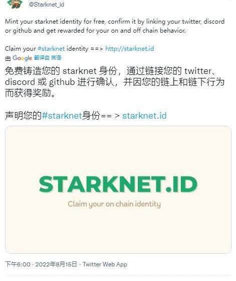 Starknet.id是StarkNet上第一个链上身份产品,通过免费铸造NFT,将Twitter、Discord、Github等身份信息和StarkNet上的地址相绑定。官方推特中还提及,会因为链上与线下行为获得奖励。