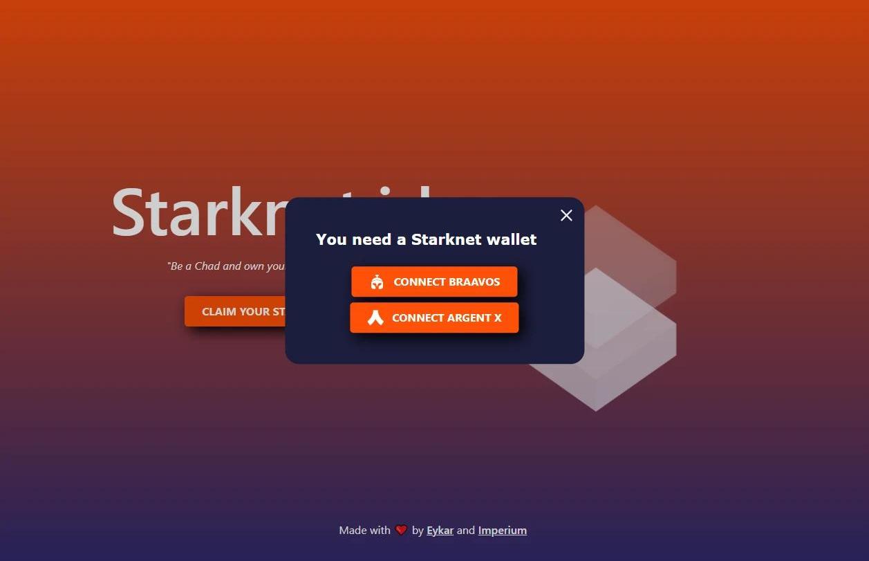 Starknet.id的制作团队是StarkNet上两个全链游戏Eykar和Imperium的开发商,获得过Matchbox黑客松竞赛的第二名。Matchbox是一个致力于孵化并推动StarkNet上全链游戏的生态资助DAO。注册教程