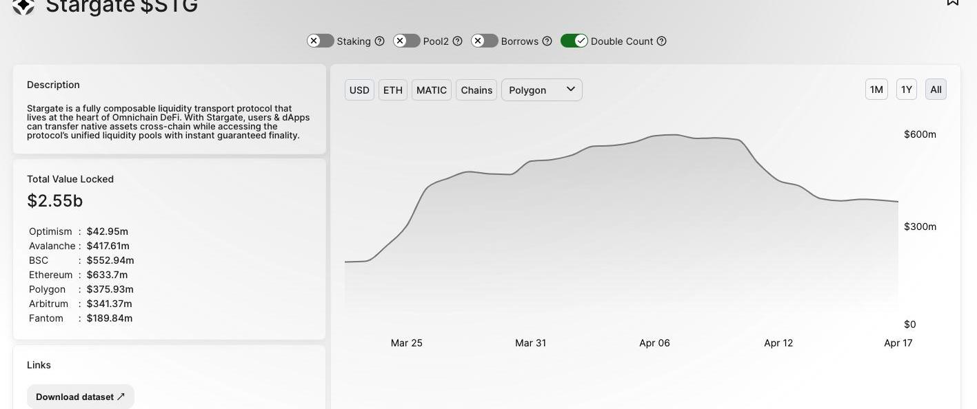 StargateStargate是基于LayerZero的跨链流动性协议,LayerZero是一个全链互操作性协议,也支持Polygon网络。Stargate于3月18日推出,推出一周后锁仓额就突破20亿美元,目前上线一个月已经成为了Polygon网络上最大的跨链协议,在Polygon网络的总锁仓量为3.75亿美元。