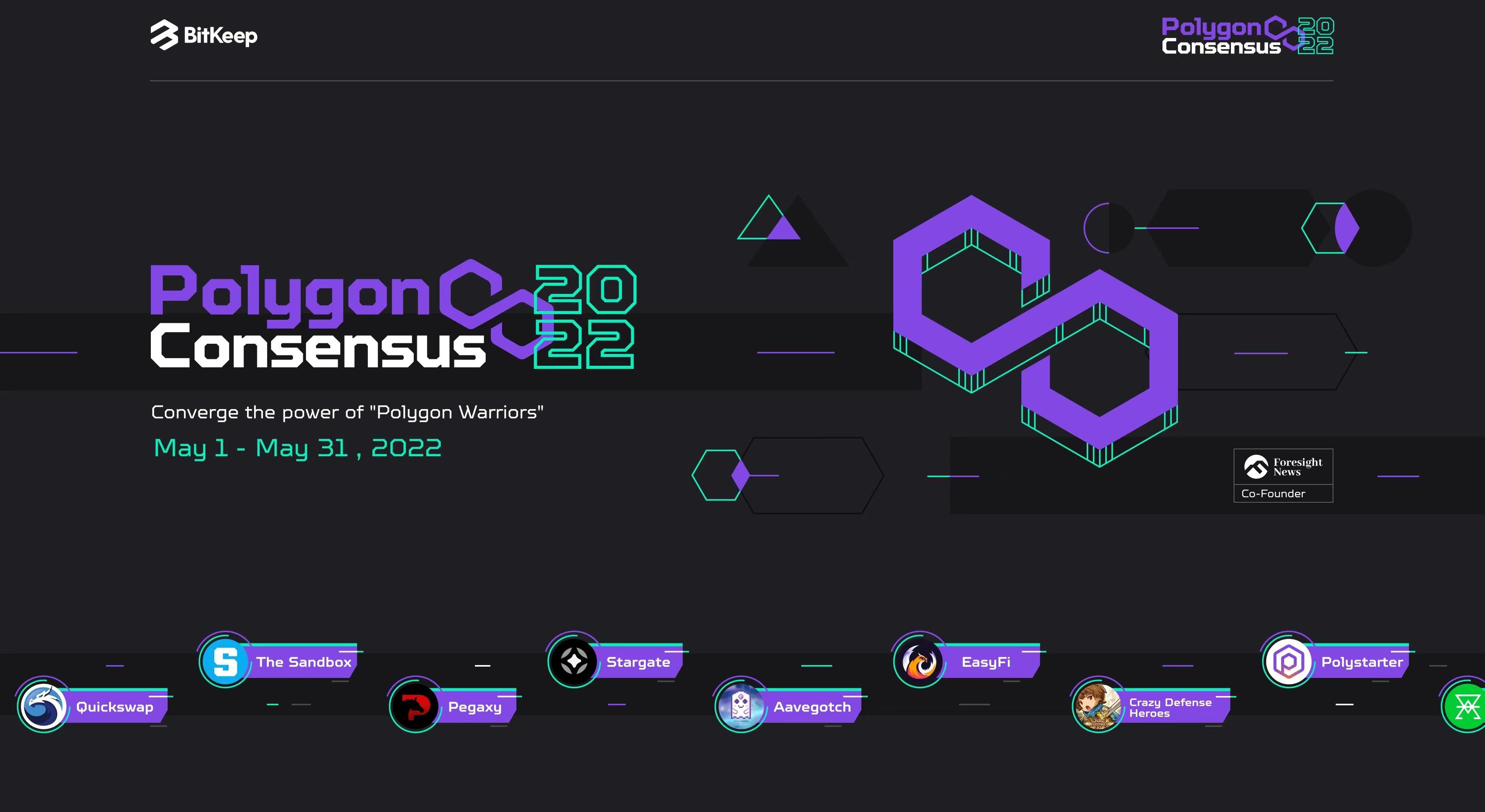 在越来越多的应用采用多链部署的背景下,Polygon网络成为多链战略的热门人选。虽然在各个Layer1区块链的挤兑之下,Polygon的TVL相比2021年整体有些下降,TVL为40.8亿美元,从去年的总锁仓量第4降至第7。此外,Polygon为了鼓励生态项目发展,推出了其基于KPI的流动性挖矿,根据每周平均用户数或TVL等KPI数据,将奖励分配给符合标准的DApp。在第一届EPOC中,有28个项目获得了参赛资格。后续每个月都会重新评估,项目社区需要在每个月15日以前提交申请。此举会鼓励越来越多的项目和社区拓展壮大。PolygonConsensus20222022年5月1日至5月31日期间,Polygon将与Web3多链钱包BitKeep和ForesightNews共同举办PolygonConsensus2022大会。本次会议旨在链接Polygon生态并展现Polygon的创新,与会项目将包括QuickSwap、TheSandbox、Pegaxy、Stargate、EasyFiV2、Aavegotchi、Polystarter等。会议期间,用户通过BitKeep钱包访问Polygon生态将无需Gas费用。