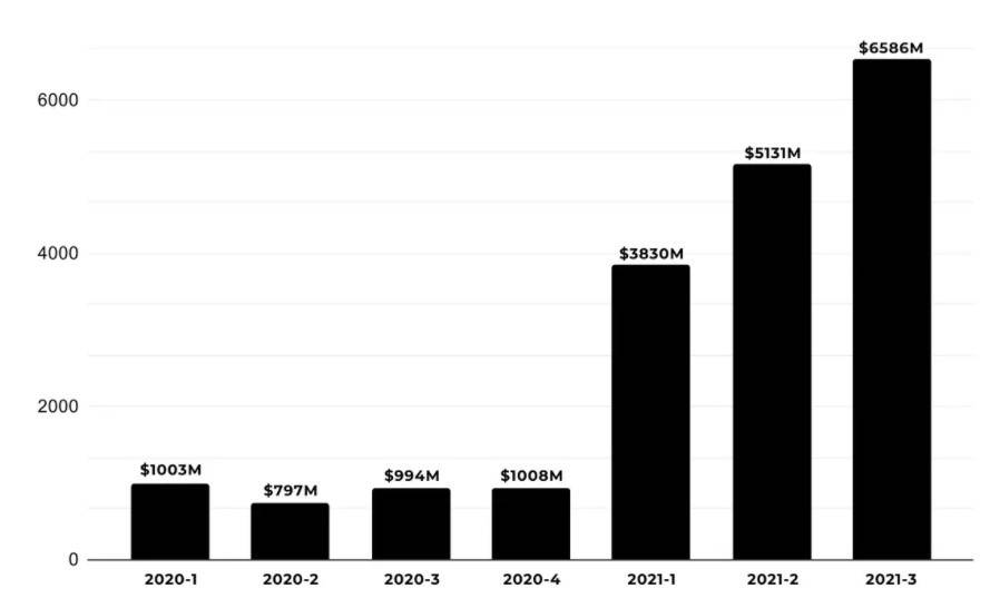 Blockdata 统计数据显示,2021 年三季度期间,加密行业已披露的公司融资额达到 65.86 亿美元,数量为 339 笔,相比二季度续创历史新高。 相对应的则是此前第一、第二季度分别为 38.3 亿美元和 51.31 亿美元,虽然这相比去年已经是创下历史新高——2020 全年融资额仅为 38.02 亿美元,但相比三季度仍是小巫见大巫,足见今年以来整个行业投融资赛道的井喷之势。