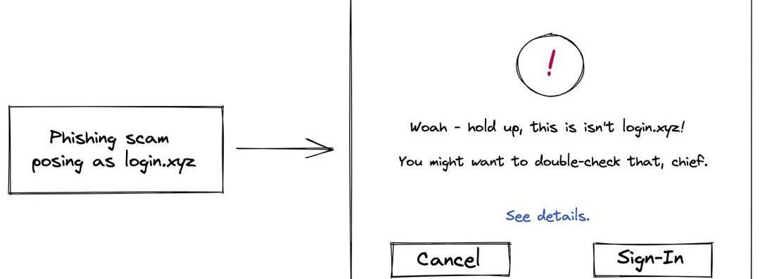 对签名信息格式达成一致后,应用程序和钱包现在可以说同一种语言了。当应用程序向用户提交签名请求时,钱包可以检查该请求,检查它是否与EIP-4361(SIWE)信息相符,并让用户知道他们正在登录一个网站。在这一点上,钱包可以呈现一个友好的程式化的界面,让用户体验更佳,并且不对用户将要采取的行动产生任何怀疑。而不是给用户一个任意的文本块来签名。用户现在只需点击一个确认对话框来「登录」,因为钱包能够「理解」签名请求。为了实现完全透明,EIP-4361规范中声明所有信息和字段仍然必须在其他子界面(如详细视图)中可用。从EIP-4361的信息中,我们可以得到一个更清晰的界面:
