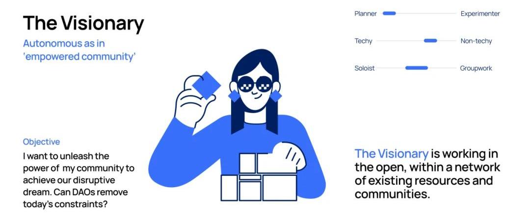 特点与修补匠不同的是,前瞻者在现有资源和社区的网络中公开工作。他们的灵感来自一个宏大、有目的的想法,而这个想法无法从传统渠道筹集资金。前瞻者可能已经是web2企业家,看到了web3的机会,并希望利用他们现有的客户/社区基础;或以其他方式发现以前不相关的领域之间的潜在协同作用。无论哪种方式,他们的知识都与颠覆性的愿景相结合,并且乐于将专家和社区聚集在一起以实现这一愿景。在表面之下,前瞻者作为该项目的傀儡处于不稳定的位置,但高度依赖他人来实现它。在那种状态下,他们意识到自己的深度不够,担心不让利益相关者失望,并担心失败的高昂代价。过程尽管有远见者将通过遵循既定路径来学习,例如加入领先的DAO,但他们更愿意听从专家的意见,而不是试图自己掌握该领域。这种方法延伸到DAO,它将由有远见的人围绕一个广泛但鼓舞人心的使命组装,但随后用大部分时间去自己弄清楚细节。目标“我想释放社区的力量,实现我们颠覆性的梦想。DAO能消除今天的限制吗?对于前瞻者来说,“自治”意味着实现雄心勃勃的颠覆性愿景的自由,这将改变现状。因为有远见的人可能会与来自web2和线下组织的普通人合作,所以最终的DAO需要有一个明确的计划和确保安全性,以保证受众的放心。它成功的衡量标准将是它在多大程度上释放了它所服务的社区的潜力。
