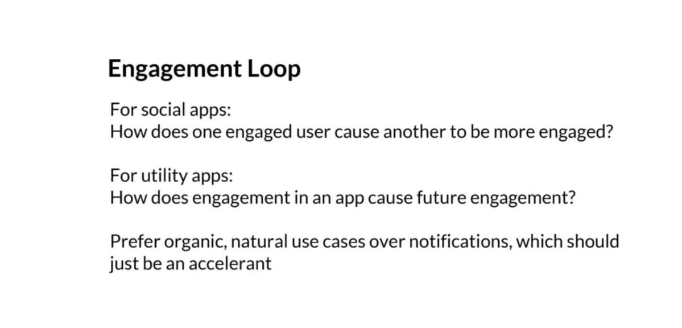 来源:https://andrewchen.com/investor-metrics-deck/参与循环对于社交app:一个参与的用户如何让其他用户更多的参与进来?对于实用性app:参与一款app会对未来更多人参与产生多大影响?提倡通过有机的、自然地使用案例,而不是通知,后者可能只是一个促进手段。很多时候,参与循环是由社交功能驱动的,比如关注图、内容、个人资料页、通知等,这些都是让用户经常回来的可扩展方式。下面是一个社交参与圈的例子。