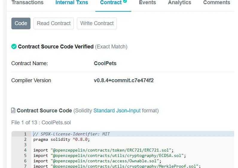 通过Etherscan验证你的代码,可以向公众确保它在以太坊上正常工作。而使用未经验证的智能合约,意味着你没有基本的履约担保,所以这是你在NFT活动过程中一定要注意的事情。例如,你可以看到CoolPets智能合约是如何通过其选中状态进行验证的。一定要小心那些没有类似勾选标记的项目。